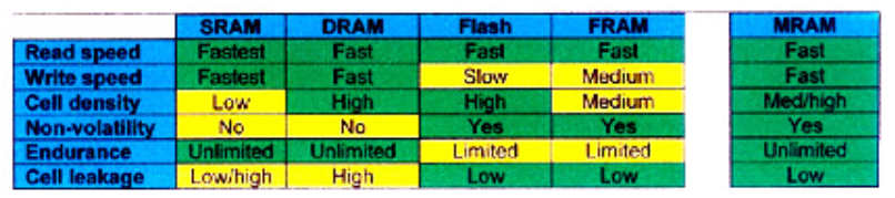 內存選項的比較與其他內存技術選項相比,MRAM具有明顯的優勢(下表1)。