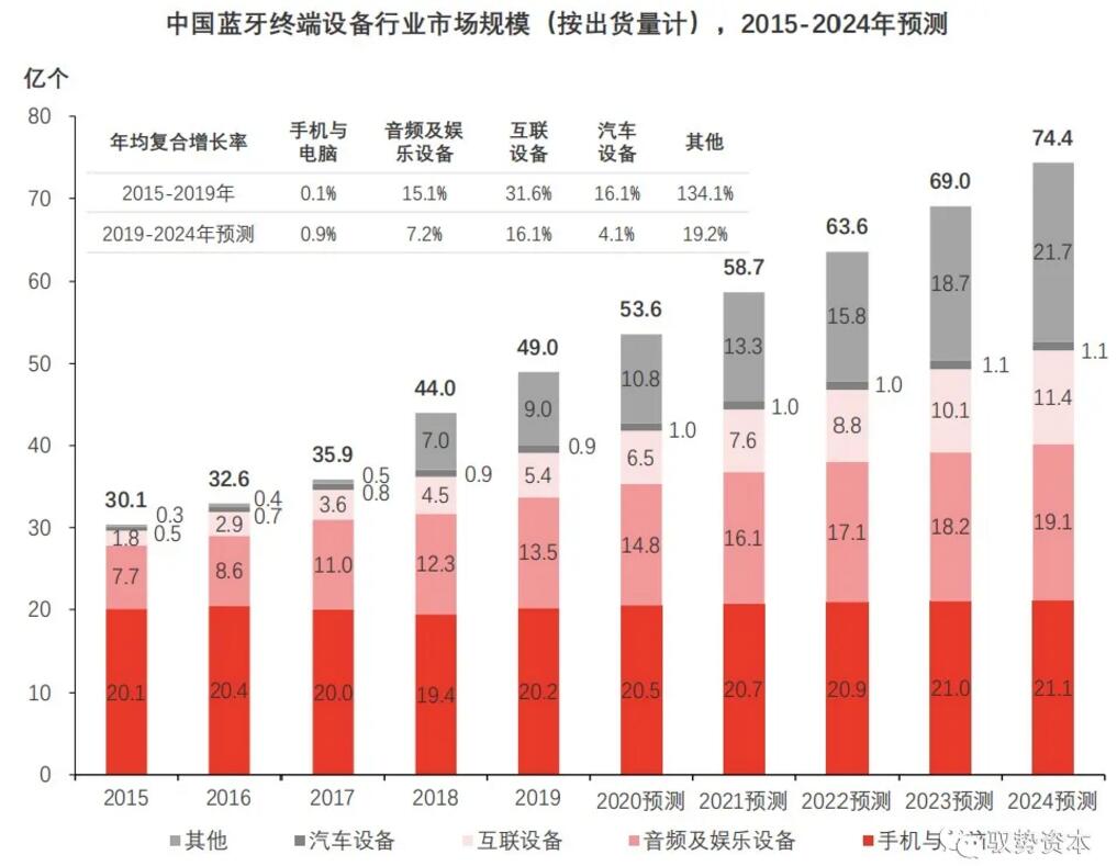 2015年至2020年期間中國藍牙終端設備出貨量穩(wěn)步提升,未來伴隨藍牙芯片在各領(lǐng)域滲透率持續(xù)提升,預計至2024年藍牙終端設備出貨量將達74.4億個。