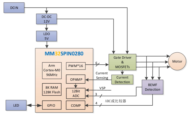 硬件系統(tǒng)由外部DC電源供電,經(jīng)降壓后得到12V給Gate driver IC供電以驅(qū)動(dòng)功率開(kāi)關(guān)管,12V通過(guò)降壓IC輸出5V給MM32SPIN系列微處理器及其他功能模塊供電。通過(guò)外部電路檢測(cè)反電動(dòng)勢(shì)過(guò)零點(diǎn)信號(hào),對(duì)應(yīng)六種不同的逆變器