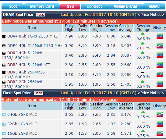 內存漲價已經是2016年下半年來的主流趨勢,2017年開年也是如此,而且本季度漲的可能更兇了,從Dramxchange的統計數據來看,1月份以來4Gb DDR4顆粒價格飆升0.51美元,漲幅18%,截至2月3日4Gb DDR4顆粒的高位價格達到了3.9美元,平均也有3.4美元,這是2015年7月30日以來的新紀錄,創下18個月來新高。