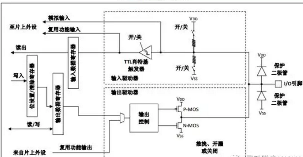 模擬輸入是指模擬信號的輸入。配置模擬輸入時,所有的上拉、下拉電阻和施密特觸發(fā)器,均處于禁止狀態(tài),因此“輸入數(shù)據(jù)寄存器”將不能反映端口上的電平狀態(tài),也就是說模擬輸入配置下,CPU不能在“輸入數(shù)據(jù)寄存器”上讀到有效的數(shù)據(jù)。