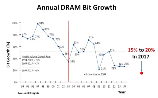 美光(Micron)表示,2017年DRAM供給位元預(yù)計(jì)成長(zhǎng)15-20%,可說是近20年來(lái)最低的位元成長(zhǎng)率(bit growth)。如此低的位元成長(zhǎng)率,主要是因?yàn)镈RAM微縮限制。市場(chǎng)上有很長(zhǎng)一段時(shí)間都沒有任何有關(guān)DRAM微縮的消息了。當(dāng)供給位元成長(zhǎng)低于45%時(shí),這時(shí)就是賣方的市場(chǎng)了。因此,DRAM的寡頭壟斷、低位元成長(zhǎng)率,以及制造擴(kuò)張遲緩,導(dǎo)致長(zhǎng)期的供應(yīng)吃緊。最終的局面可能就是DRAM的價(jià)格不斷上漲,而供應(yīng)面卻不會(huì)有任何改變。